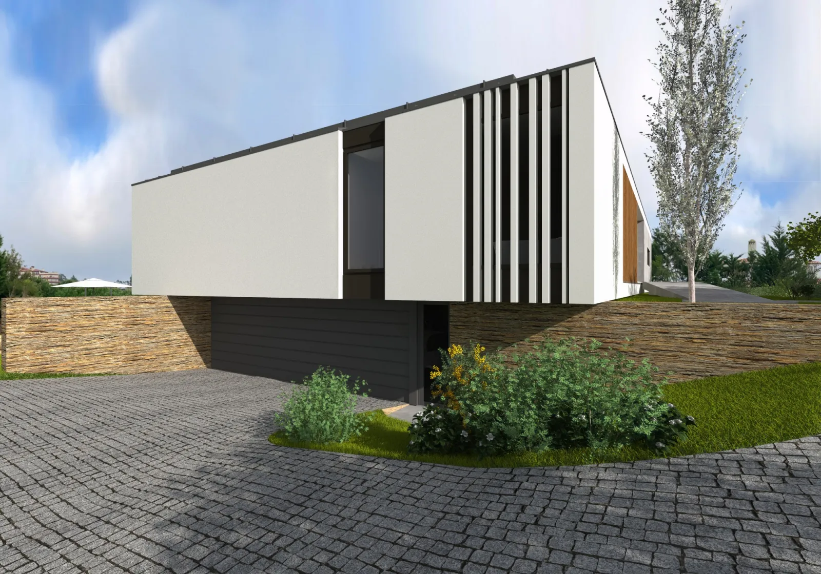 Habitação com um desenvolvimento volumétrico simples, que em conjugação com o uso de materiais de acabamento naturais, promovem uma relação simbiótica com a paisagem onde se insere, por via do fortalecimento das relações visuais entre ambos.